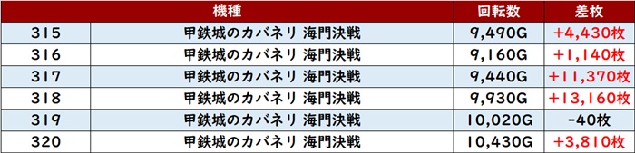 まずは「カバネリ海門決戦 315~320」から差枚数+1.1万枚超えを2台確認!