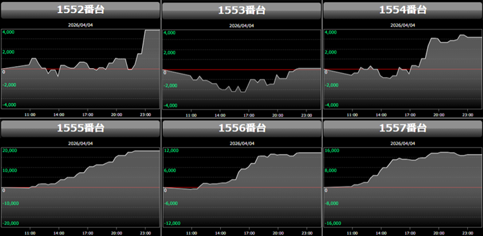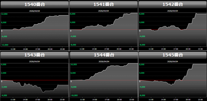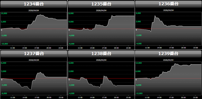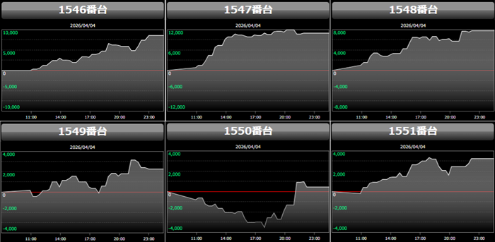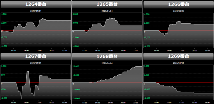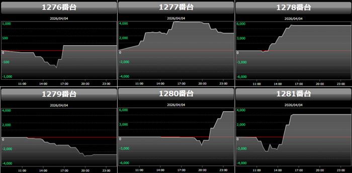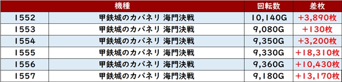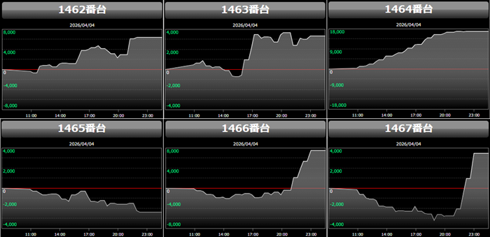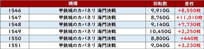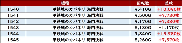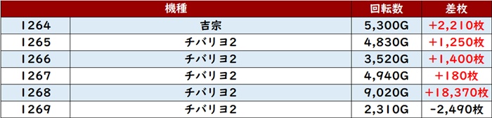 差枚数+16,840枚を筆頭に6台中5台が差枚数+3,300枚超えと力強い出玉感を叩き出した。