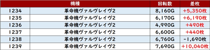 全台回転数8,100G超えの高稼働に加え、差枚数+1万枚超えが6台も現れ、間違いなくこの日の主役となった!