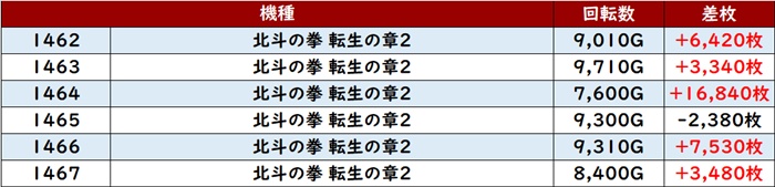 続いて「北斗転生2 1462~1467」も強烈な出玉感を記録!