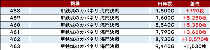 まずは「カバネリ海門決戦 458~463」の6台中5台がプラス差枚と申し分ない結果に!