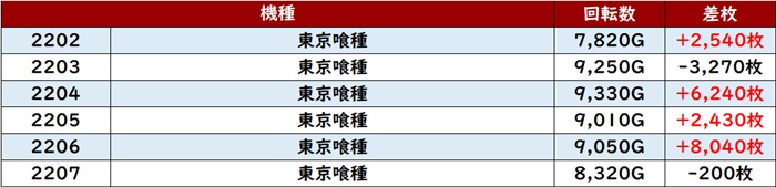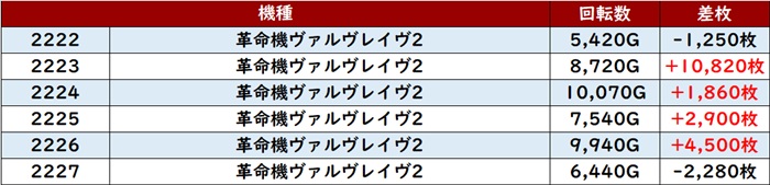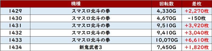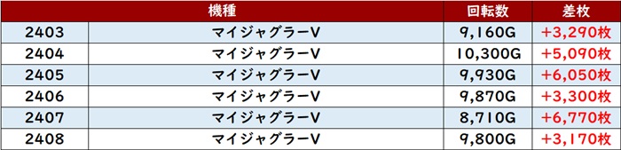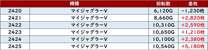 特に「マイジャグ5 2420~2425」が全台差枚数+3,100枚超えを叩き出し、盛り上がりを牽引した。