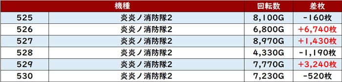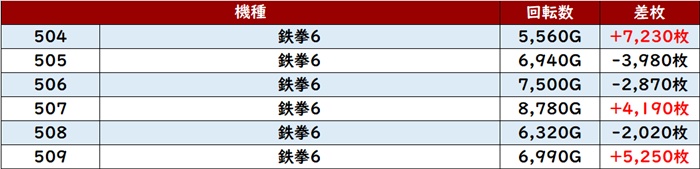 続いて「鉄拳6 504~509」の半数が差枚数+4,100枚越えを記録!