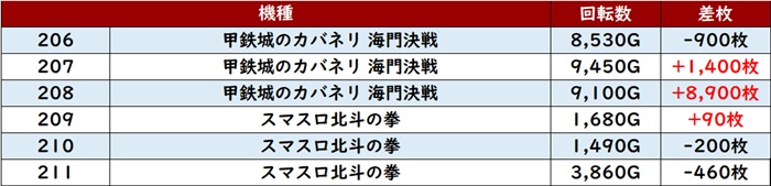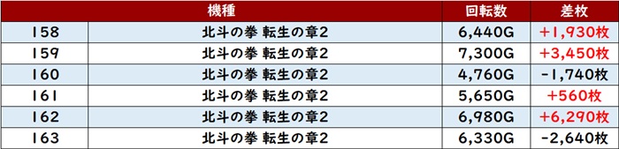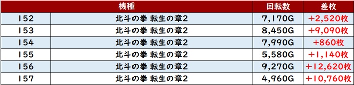 まずは「北斗転生2 152~157」の内差枚数+1万枚超えを2台が記録し、全台プラス差枚と圧巻の記録に!
