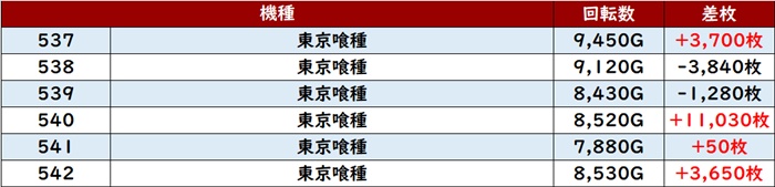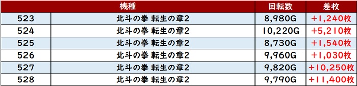 まずは「北斗転生2 523~528」が回転数1万G超えが見られる程の高稼働を記録!