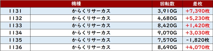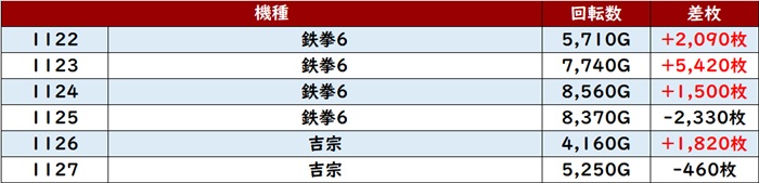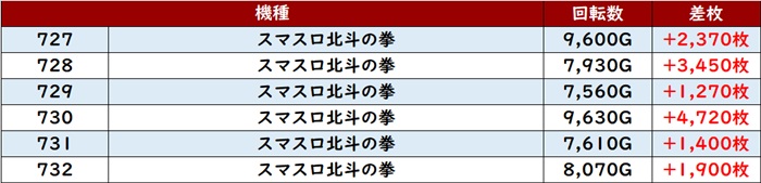 まずは「スマスロ北斗 727~732」が全台大幅プラス差枚と絶好調!