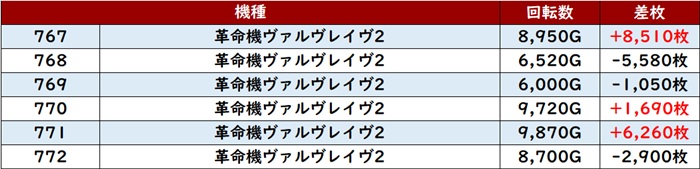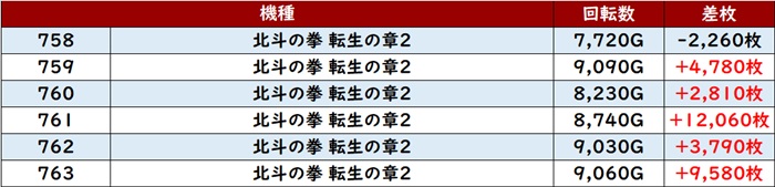 次いで「北斗転生2 758~763」から差枚数+9,500枚超えを2台確認でき、好調さが際立つ展開に!