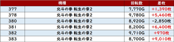 まずは「北斗転生2 377~383」が抜群の出玉感を記録!