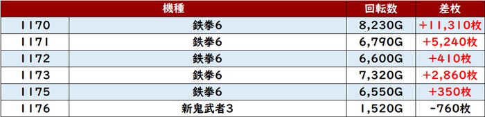 また「鉄拳6~新鬼武者3 1170~1176」から差枚数+1.1万枚超えと圧巻の出玉感を記録する台を目撃!