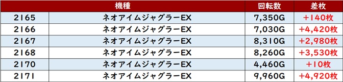 6台中5台がプラス差枚且つ全台回転数7,770G以上と一際目を引く一角となった!