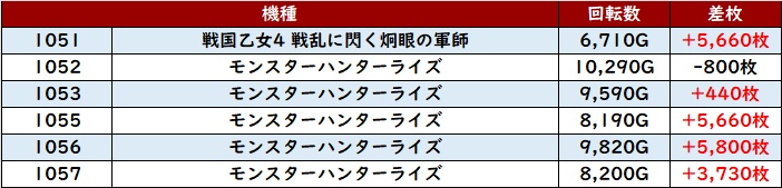 続いて「乙女4~モンハンライズ 1051~1057」が大半が差枚数+3,700枚超えと絶好調!