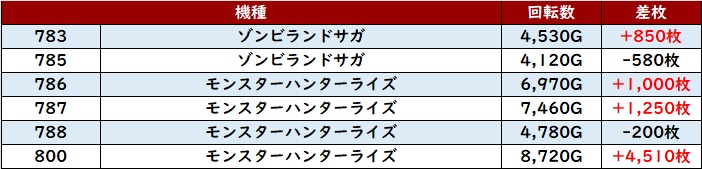 差枚がマイナスになった台についても回転数がついているので、何かしらの粘る要素があったのだろう。