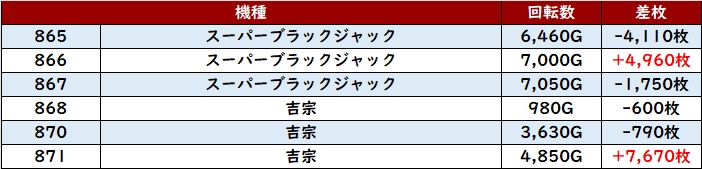 また「スーパーブラックジャック~スマスロ吉宗 865~871」が大健闘!