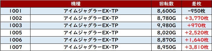 まずは「アイムEX-TP 1001~1007」6台中5台がプラス差枚と素晴らしい結果に!