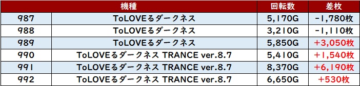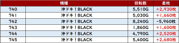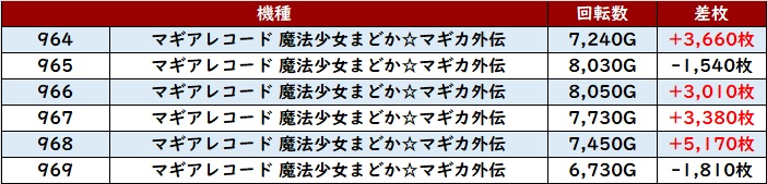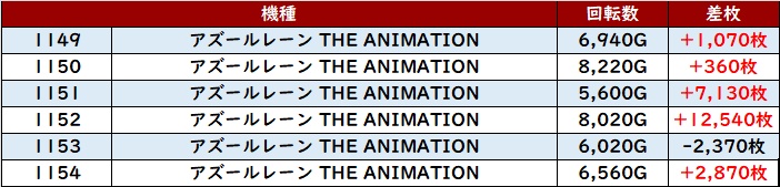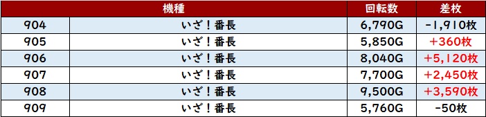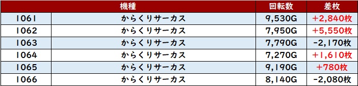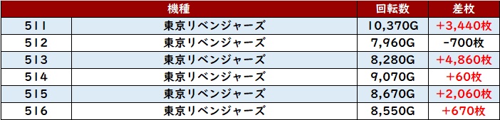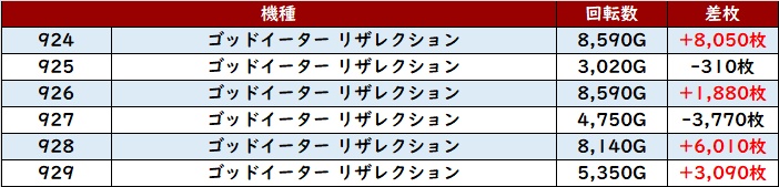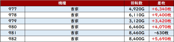 6台中5台が差枚数+3,400枚超えと大幅プラス差枚を記録しており、ぶん回されている台も多かったことから状況の良さ故の出玉感であることは間違いなさそうであった。