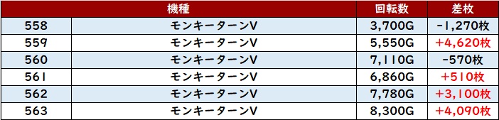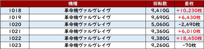 まずは「ヴヴヴ 1018~1023」の6台中4台が差枚数+6,000枚超えと衝撃的な結果に!