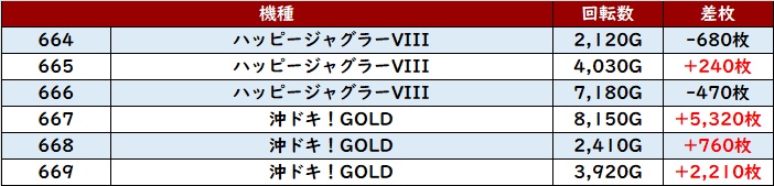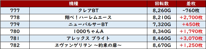 全台回転数8,300G以上に加え大半が大幅プラス差枚を記録し、活気を後押しする役目を担った。