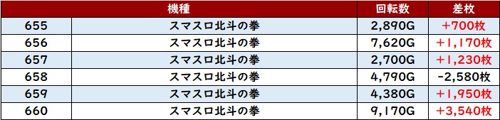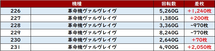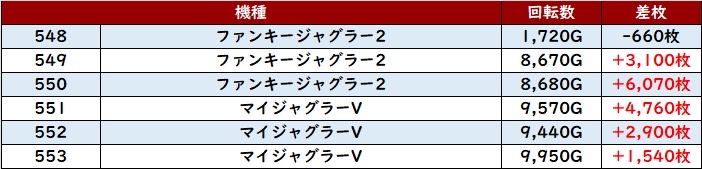 6台中5台がプラス差枚に加え差枚数+13,960枚と驚愕の出玉感も見られ、終日にわたって熱気が漂っていた。