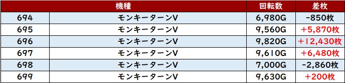 更に「モンキー5 694~699」半数以上が回転数9,500G超えと凄まじい稼働に!