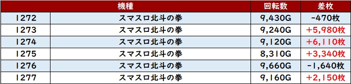 まずは「スマスロ北斗 1140~1145、1272~1277」が2箇所にわたって素晴らしい結果に!