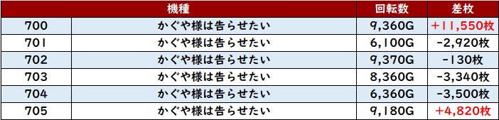 続いて「かぐや様 700~705」から差枚数+11,550枚と目を見張る出玉感を目撃!