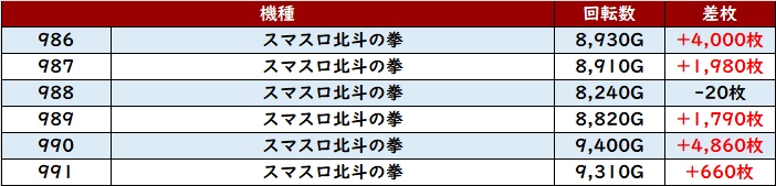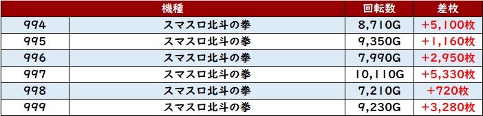 まずは「スマスロ北斗 986~991、994~999」が素晴らしい結果に!