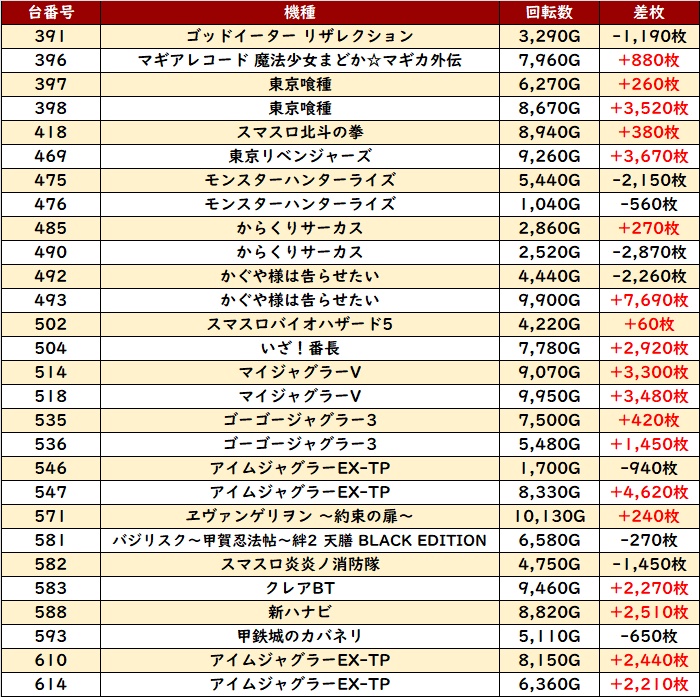 他にも「ジャグラーシリーズ」が盛況ぶりを発揮し、「マイジャグ5」「ゴージャグ3」など素晴らしい結果を記録する台で溢れていた。
