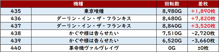 朝イチは「東京喰種」「東京リベンジャーズ」「番長4」「カバネリ」「マギレコ」の順に埋まった。