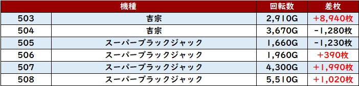 半数が回転数8,400G超えの熱狂ぶりで、差枚数+12,090枚を筆頭に素晴らしい活躍を魅せた!