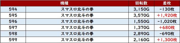 続いて「スマスロ北斗 594~599、608~613」が複数箇所で絶好調!