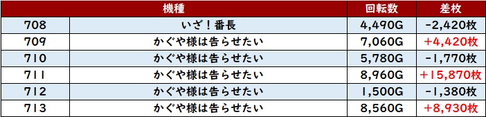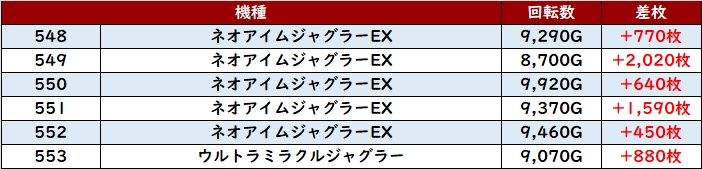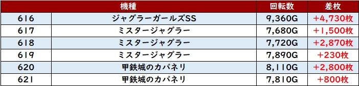 こちらは全台プラス差枚で、差枚数+4,730枚を筆頭に強烈な数値を記録していた。