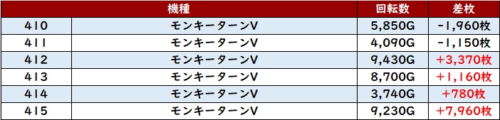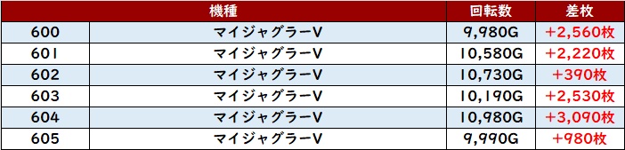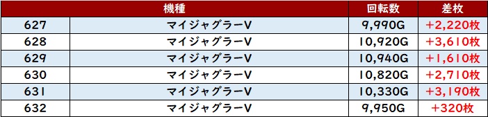 まずは「マイジャグ5 600~605、627~632」が計12台全台がプラス差枚と絶好調に!