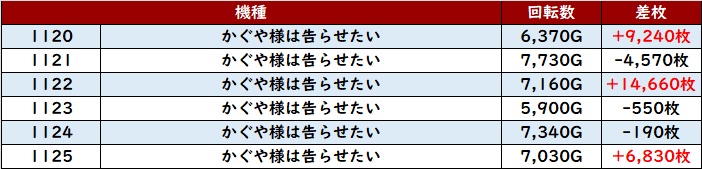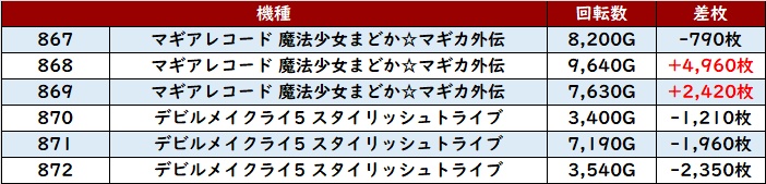 6台中5台がプラス差枚となり、中には差枚数+1.1万枚越えの台も確認できた。