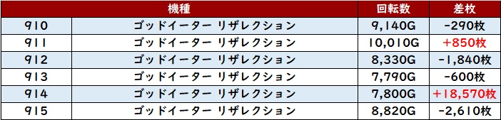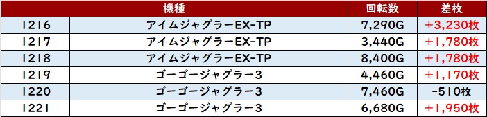 その稼働故に状況の良さが引き出され、6台中5台が大幅プラス差枚且つ差枚数+1,6万枚越えの台が2台見受けられた!