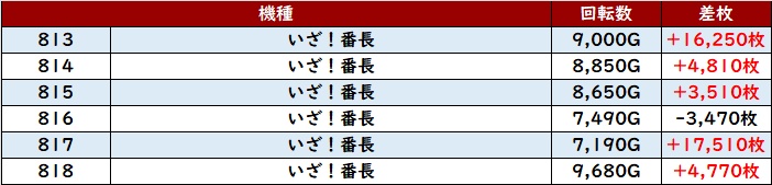 まずは「いざ番 813~818」が全台回転数7,100G超えと終日高稼働をキープ!