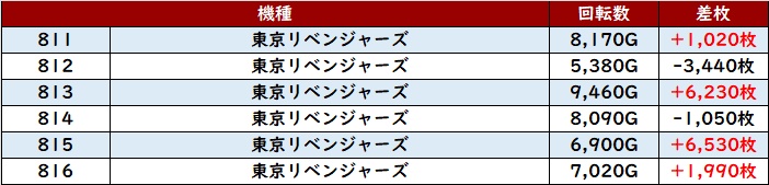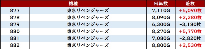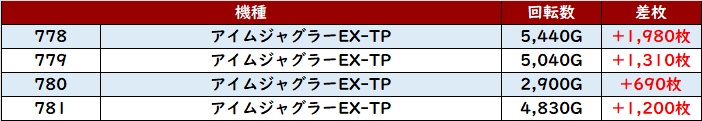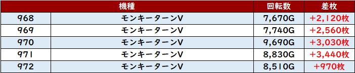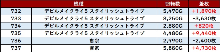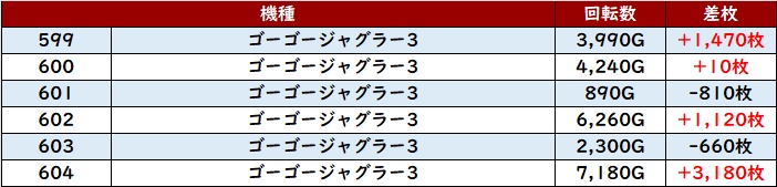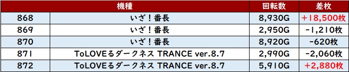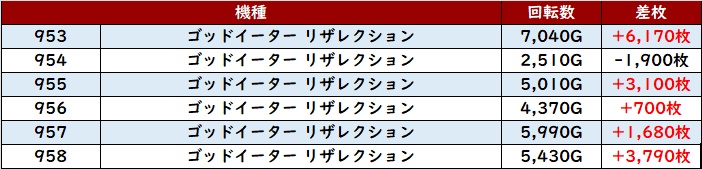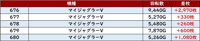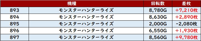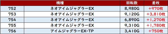 こちらも回転数8,500G超えの稼働に加え、全台差枚数+2,600枚超えの出玉感を記録し素晴らしい結果を見せつけていた。
