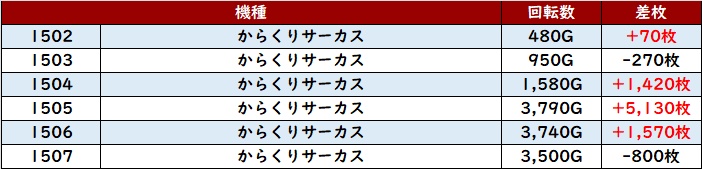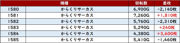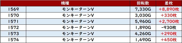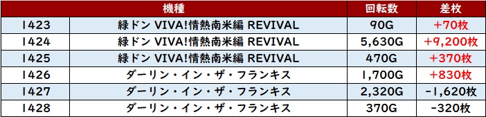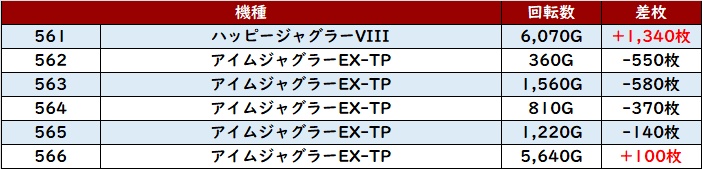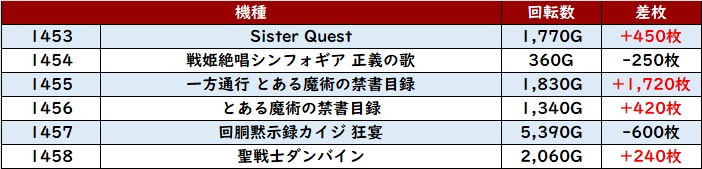 6台中5台がプラス差枚を記録し、スロットコーナー内の出玉感を底上げていた。