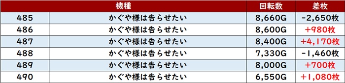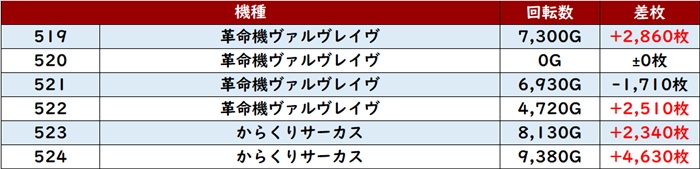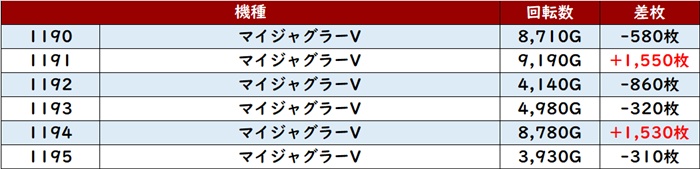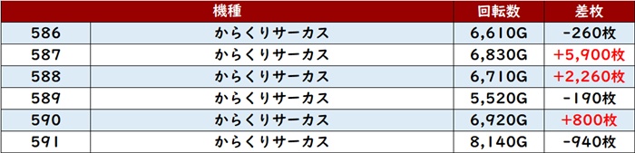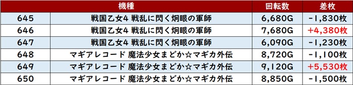 全台回転数7,500G超えと高稼働を保っており、更に差枚数+9,100枚超えの台が複数見られるなど、一際大きな熱気に包まれる一角であった!