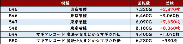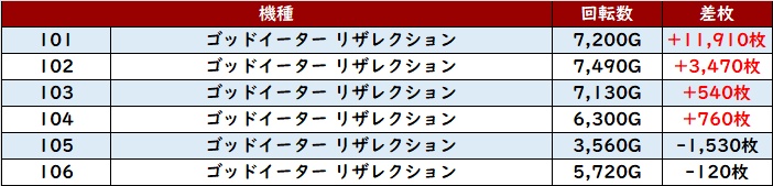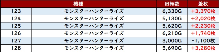 こちらも抜群の稼働状況に加え、差枚数+11,910枚を筆頭に盛り上がりを演出していた。