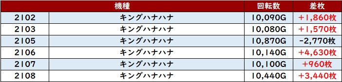 続いて「キンハナ 2102~2108」が驚愕の全台回転数1万G超えに!