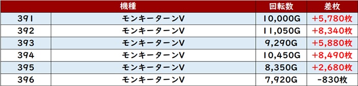 続いて「モンキー5 391~396」が回転数1万G超えが大半を占める状態に!