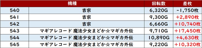 まずは「スマスロ吉宗~マギレコ 540~545」の半数が差枚数+1万枚超えと滅多に見られない光景に!