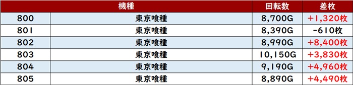朝イチは「東京リベンジャーズ」「東京喰種」「スマスロゴッドイーター」「モンキー5」「カバネリ」「いざ番」と流れ、Aタイプの一部機種以外は満台となった。