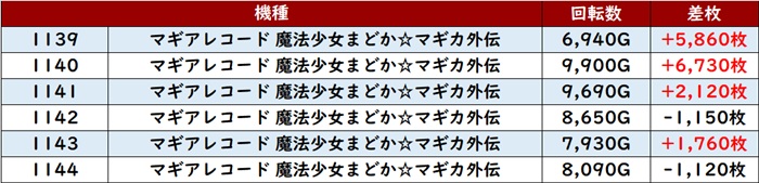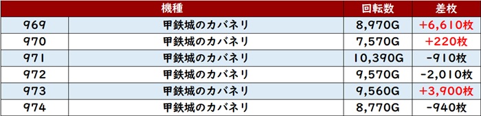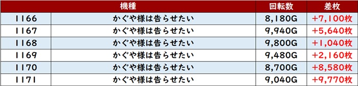 続いて「かぐや様 1166~1170」が全台回転数8,100G超え且つ大幅プラス差枚を記録!